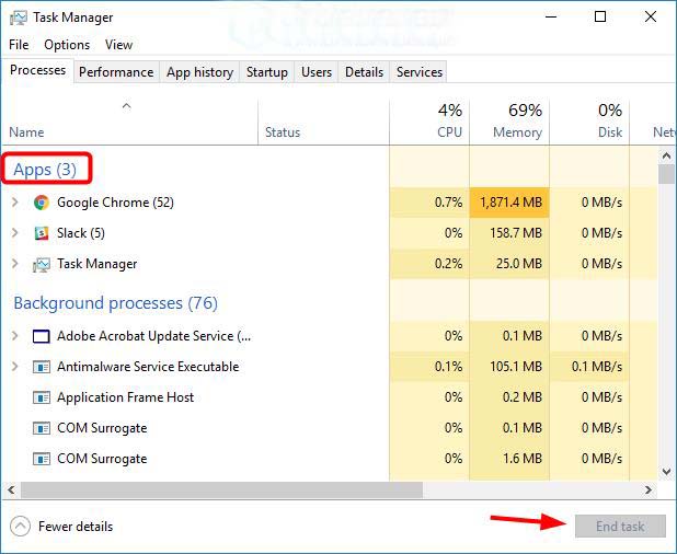 Chọn từng chương trình trong Ứng dụng , sau đó nhấp vào nút End Task ở phía dưới bên phải.
